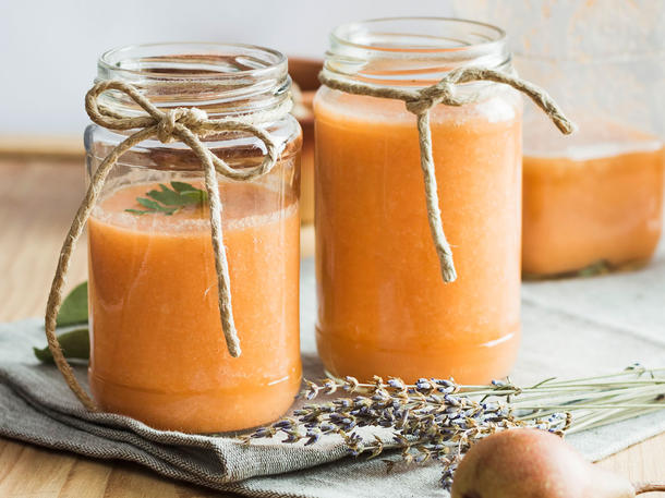 Karotten, Äpfel und Birnen zusammen entsaften. Danach 1 bis 2 EL gutes Olivenöl dazugeben, verrühren und genießen.